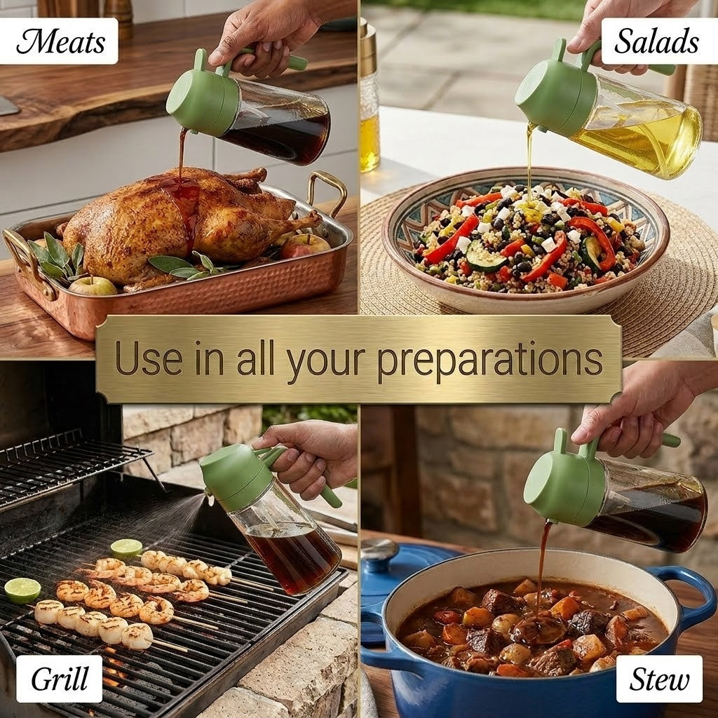 Dual-mode oil dispenser combining spray and pour in one leakproof, refillable glass bottle.